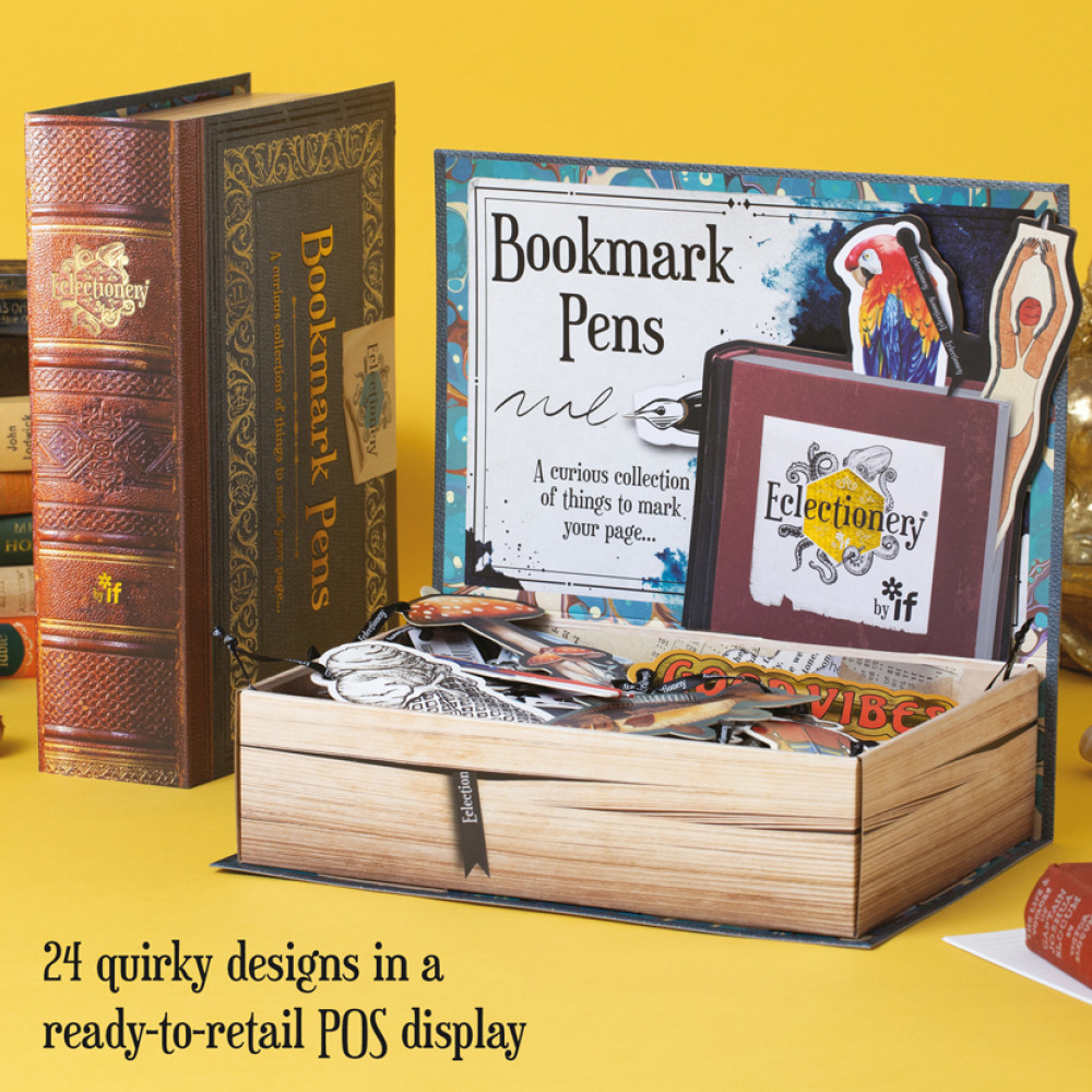 24 random quirky designs & styles to rummage through in a brilliant POS displayCleverly designed die cut card 'flat' bookmarks each with a pen inside & branded ribbonCome with wax tips to prevent unwanted scribbles at retailDouble sided funky, vintage and eclectic themes with foiling details tooMark your page (as a bookmark) or indeed mark your page (with a pen)!