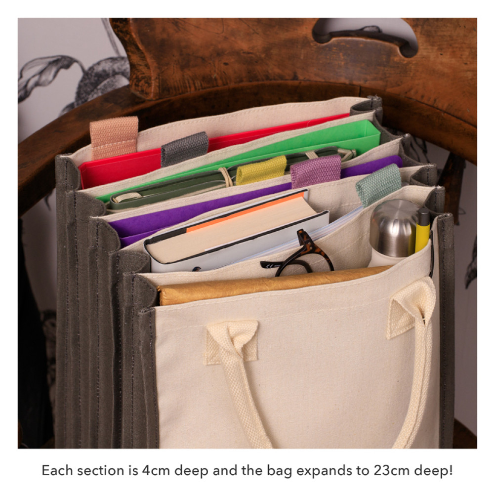 One bag - five tabbed concertina sections100% cotton - tough material with sturdy handlesFits A4 files and everything less - each section is 4cm deep when fully openedA brilliant creation for teachers, students, hobbyists or people with just lots going on!Two colourways - co-ordinate and work with the Bookaroo range
