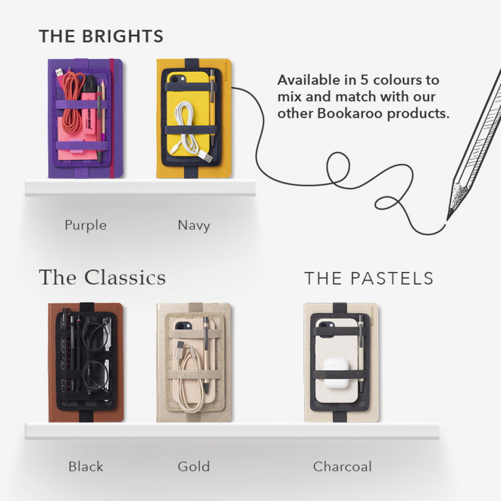 A super stylish and ingenious gift for stationery lovers and book carriers of all ages and genders. Perfectly positioned, interwoven, non-slip elastic securely holds all the stuff you need for your day at work, uni, school, or trip! Look... no hands! Part of the Bookaroo range of incredibly practical lifestyle accessories.