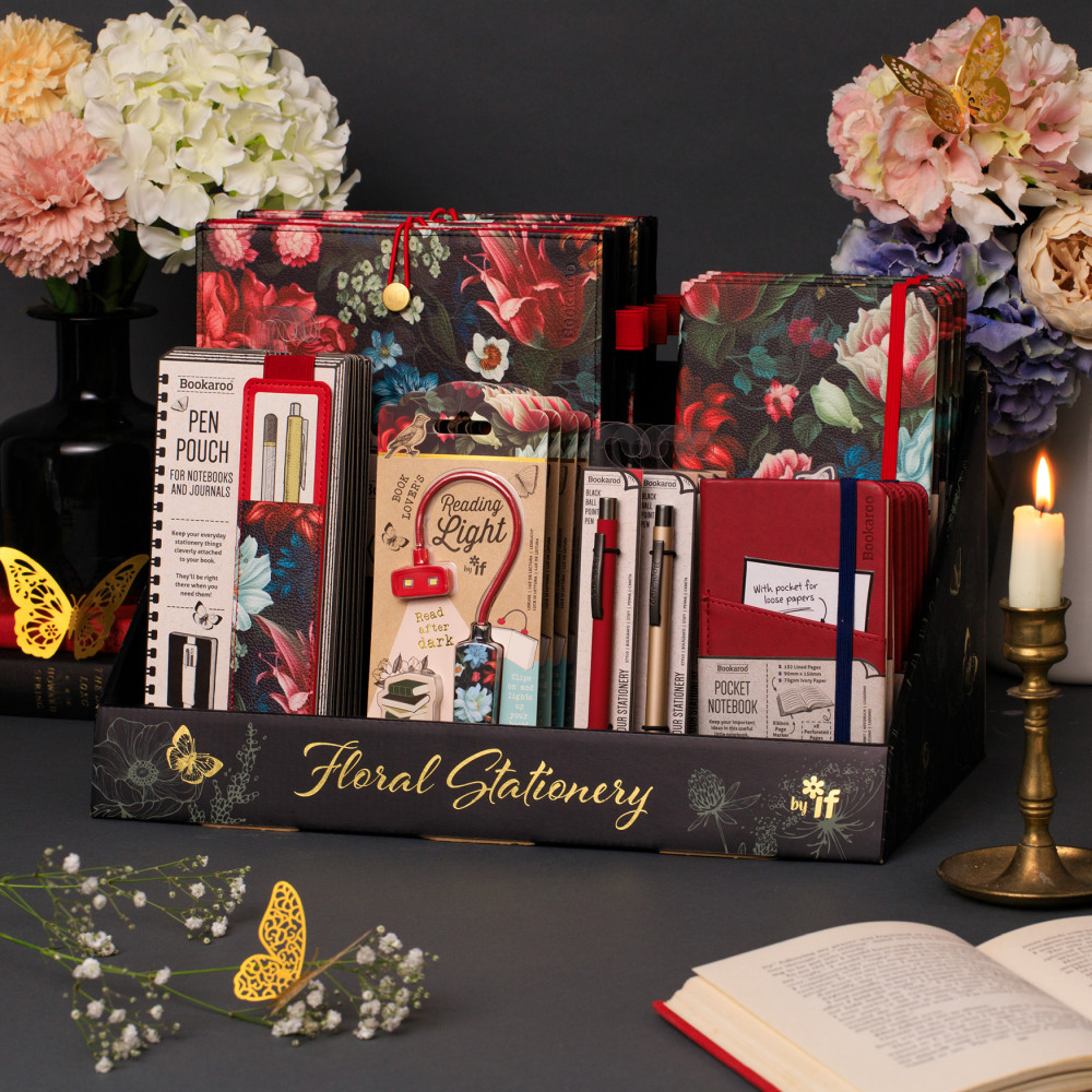 A set of 'Dark Floral' themed giftable stationery and lifesyle accessories. Adorned with a beautifully illustrated floral collage, depicting vivid colored blooms on a black background. A very popular theme for sales, this classic moody print is especially current in interiors, fashion and gifts.