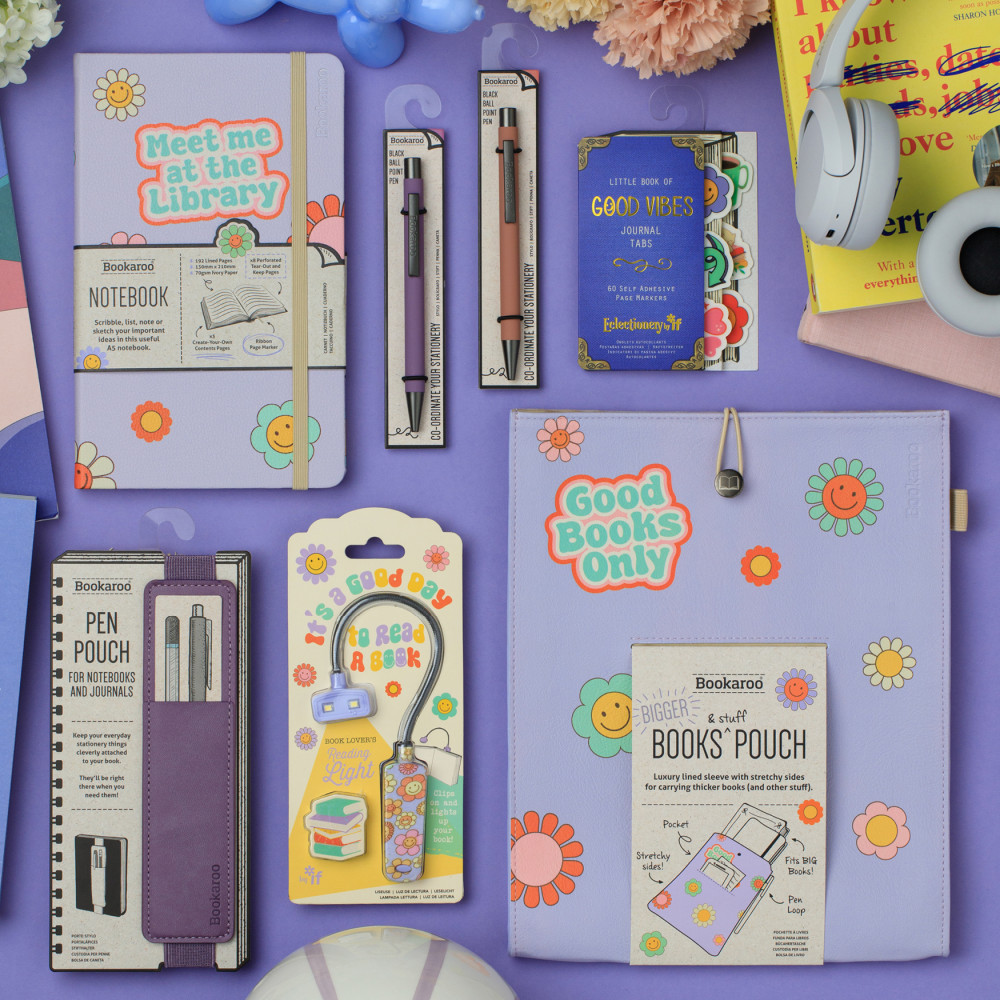 A set of bright and positive themed giftable stationery & lifestyle accessories. Exuding 'Good Vibes', this set radiates the current mindful positive messages. This 'vibe' is a very popular message and 'look' with a pastel coloured 70s style, smiley flower pattern. This 'Ready to Retail' display features some of our best selling individual items, including our staple A5 hard back journal, our dinky clip-on book light in the same theme, a 'Bigger' book pouch to keep your notebooks and novels in and keep your iPad safe. Now designed with expanding side so you can keep even more safely inside... or maybe just bigger books? With the additional Bookaroo Pens and ever popular Pen Pouch in matching colour and our NEW Eclectionery Journal Tabs. Highly shoppable and looks great in a booky or gifty environment.