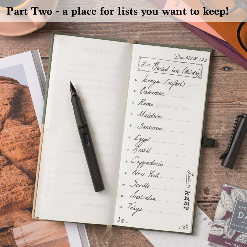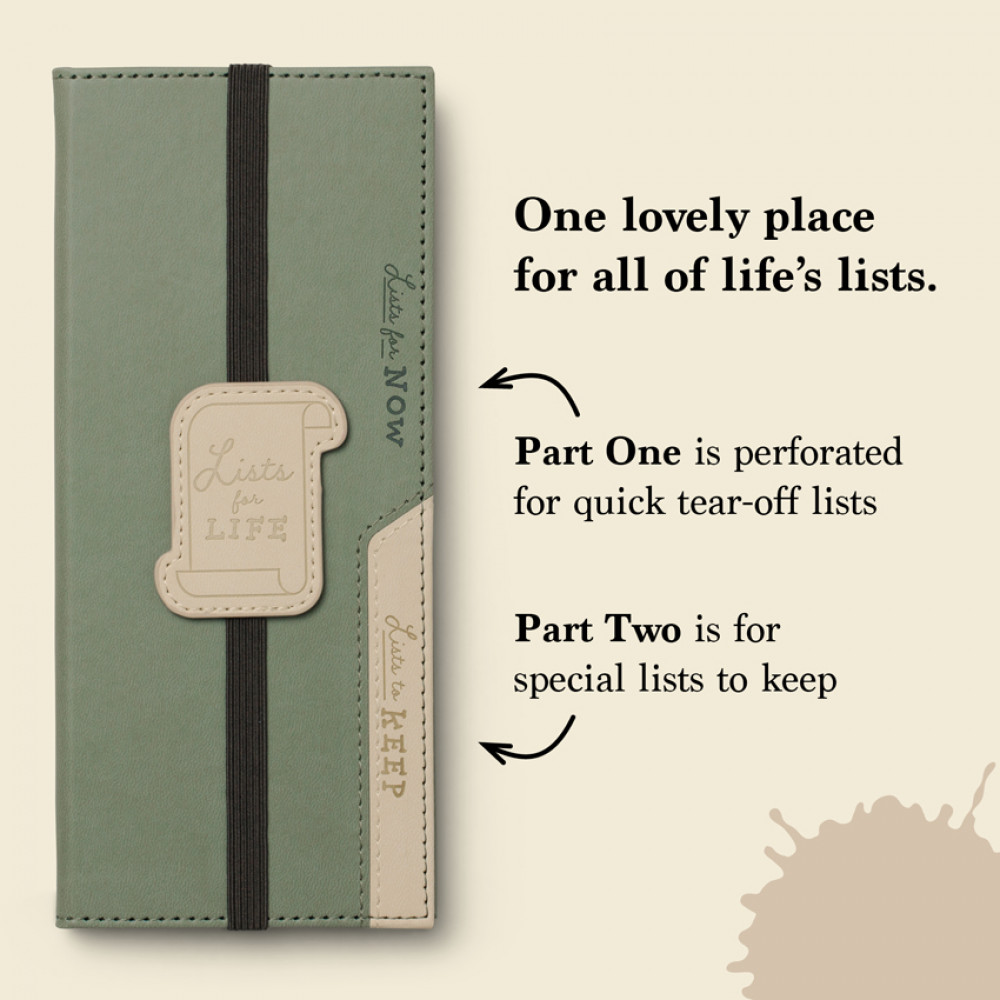 One lovely place for all of life's lists. Part One is perforated for quick tear off lists for food shopping, DIY jobs or 'things to do today'. Part Two is for special lists to keep! This is the place to write down and remember your favorite restaurants, places to visit, names for your future family or favorite quotes. The lists you normally lose! Bound in soft sage and cream faux leather with lots of lovely details. A very nice gift idea for people you love.