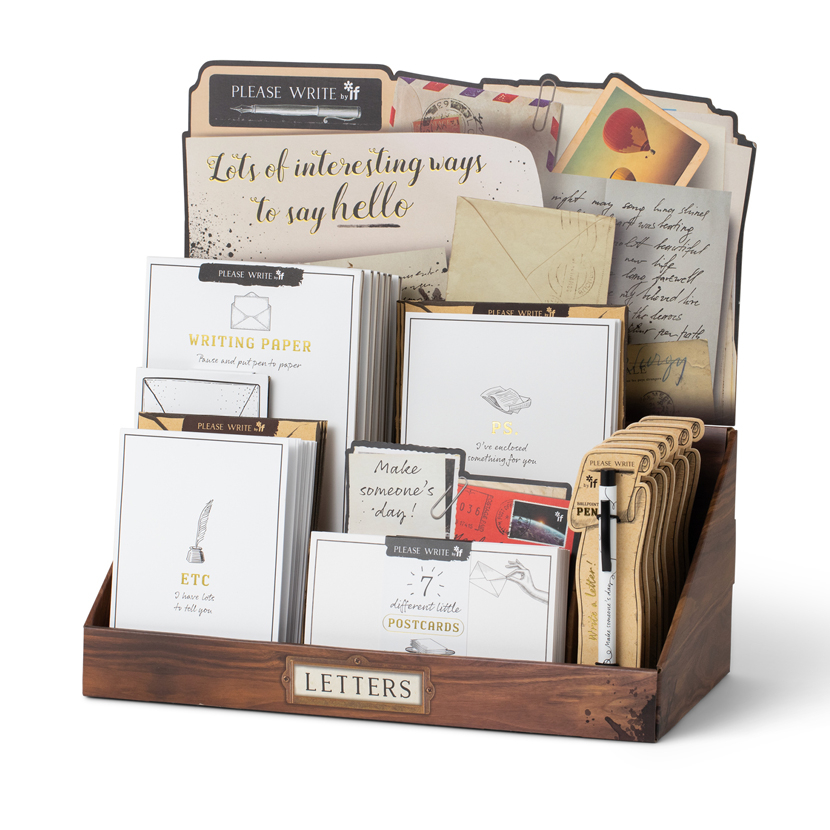 ETC - A clever-fold out notecard (& envelope) designed for those who run out of space in a normal card. This one reveals 5 sides of neatly ruled good quality card. Write a loooong note!WRITING PAPER - Something to write? A modern version of a traditional writing pad with envelopes. 30 sheets of 100gsm smooth paper, guide line sheet and magnetic pocket with 10 envelopesP.S. - A notecard & envelope with a difference. Enclose a little note, photo, family newsletter, (or even just a stamp) in the neat little corner pocket and there's still plenty of room to write your message7 LITTLE POSTCARDS - Seven little ways to say a quick 'hello'. A set of good quality traditional little postcards, each with a different beautifully illustrated image. Make someone's day every dayPEN - A pen with the potential to make a lot of people very happy. With an extra large ink cartridge, a soft touch printed barrel and pretty shaped packaging. The perfect Please Write partner