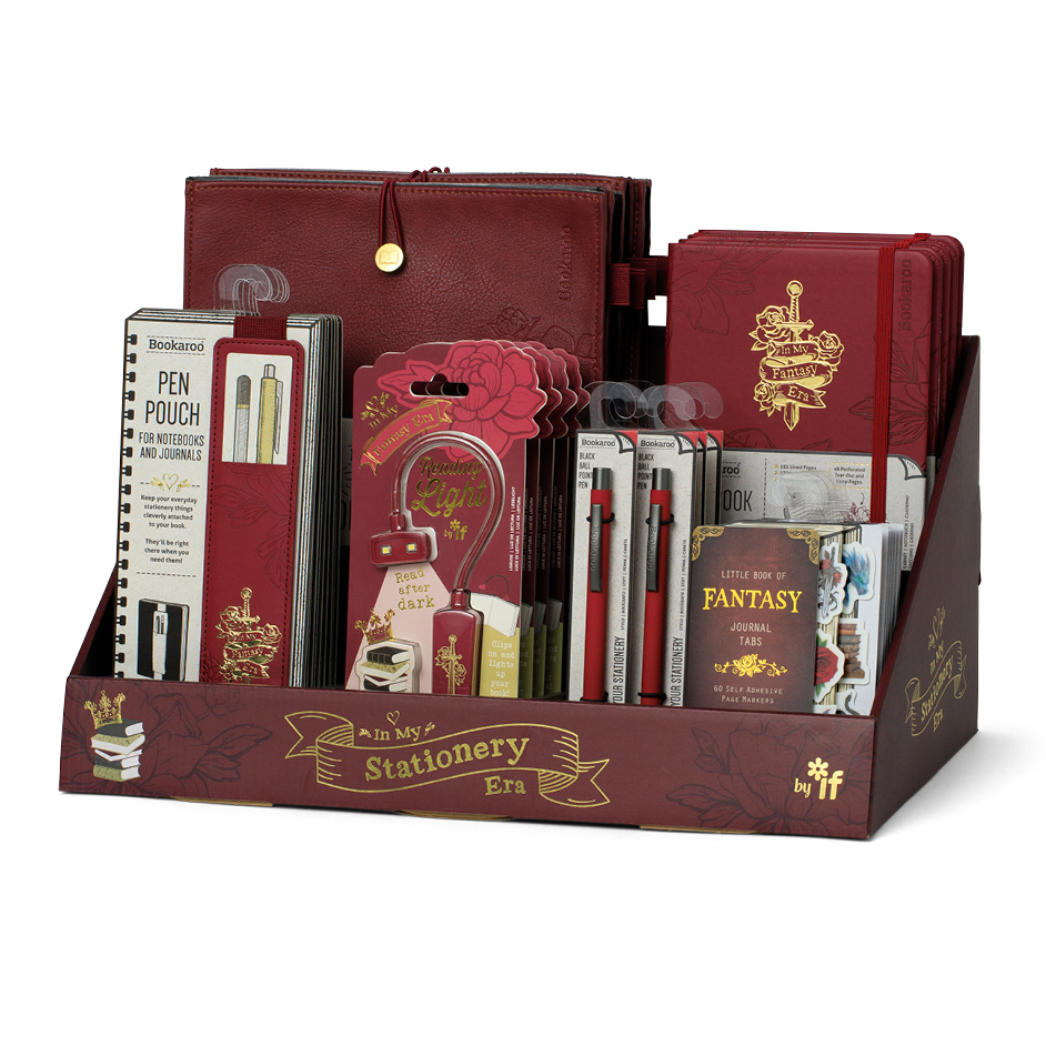 A set of themed giftable stationery and lifestyle accessories based on the phenomenon of fantasy and romance literature. A strong and distinct look in deep red with a rose floral design with a gold foiled 'In my Fantasy Era' emblem. This imagery is an especially current theme in literary, interiors, fashion and gift. This 'Ready to Retail' display features some of our best selling individual items, including our staple A5 hard back journal, our dinky clip-on booklight in the same theme, a 'Bigger' Book Pouch to keep your notebooks, novels and iPad safe. Now designed with expanding sides, so you can keep even more safely inside... or maybe just bigger books? With additional Bookaroo pens in a matching colour, Pen Pouch and our NEW Eclectionery Journal Tabs. Highly shoppable and looks great in a booky or gifty environment.