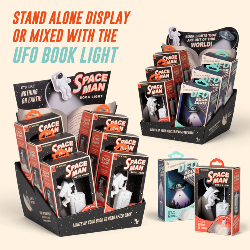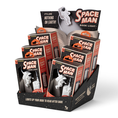 Desired by retro loving readers and space geeks of any age, this 3D astronaut casts a 2 LED light beam onto your book. And fuelled by 3 AAA batteries for a longer life, this light won't leave you out in the dark. Clip the 'base control' unit safely onto your book, adjust the brightness level and move the bendy 'air hose' to create the right reading atmosphere for you! In a really cool retro style all-cardboard display box with moulded 'Planet' shaped hook and available with an out of this world counter top display. One small step for book lovers - one giant leap for reading in the dark!
