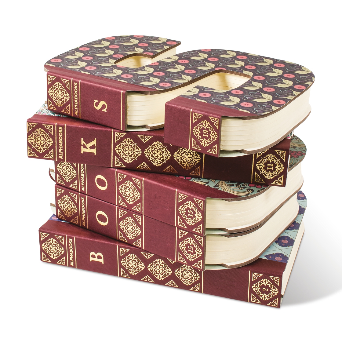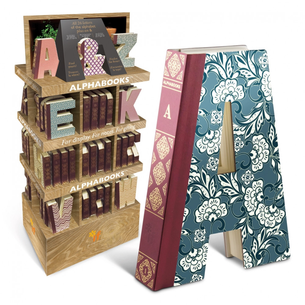 Books stand up for displayBuckram bound with gold foil decoration120gsm blank inner pages24 assorted patterns27 letter choices (A to Z plus &)