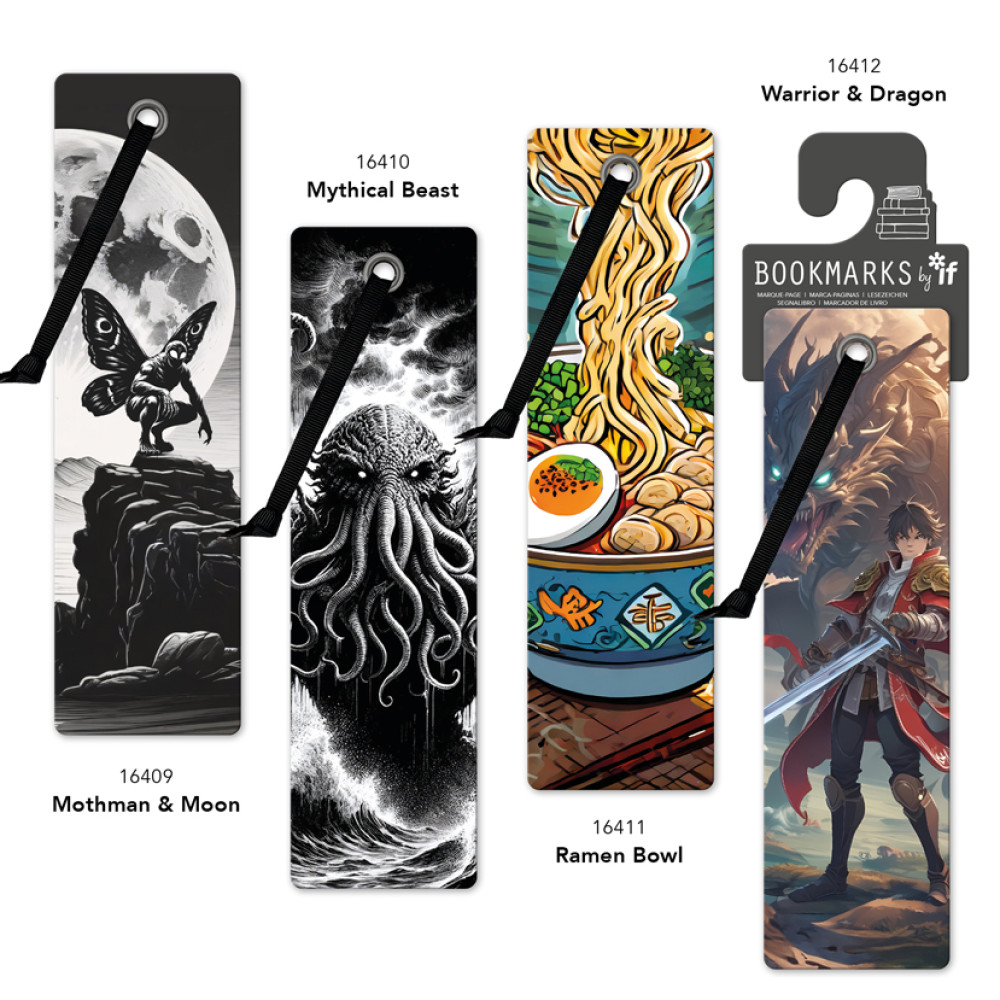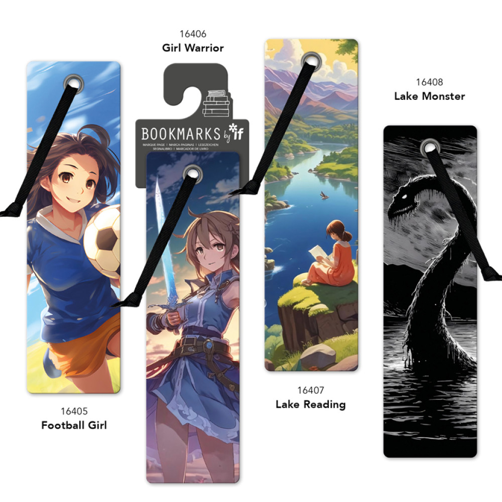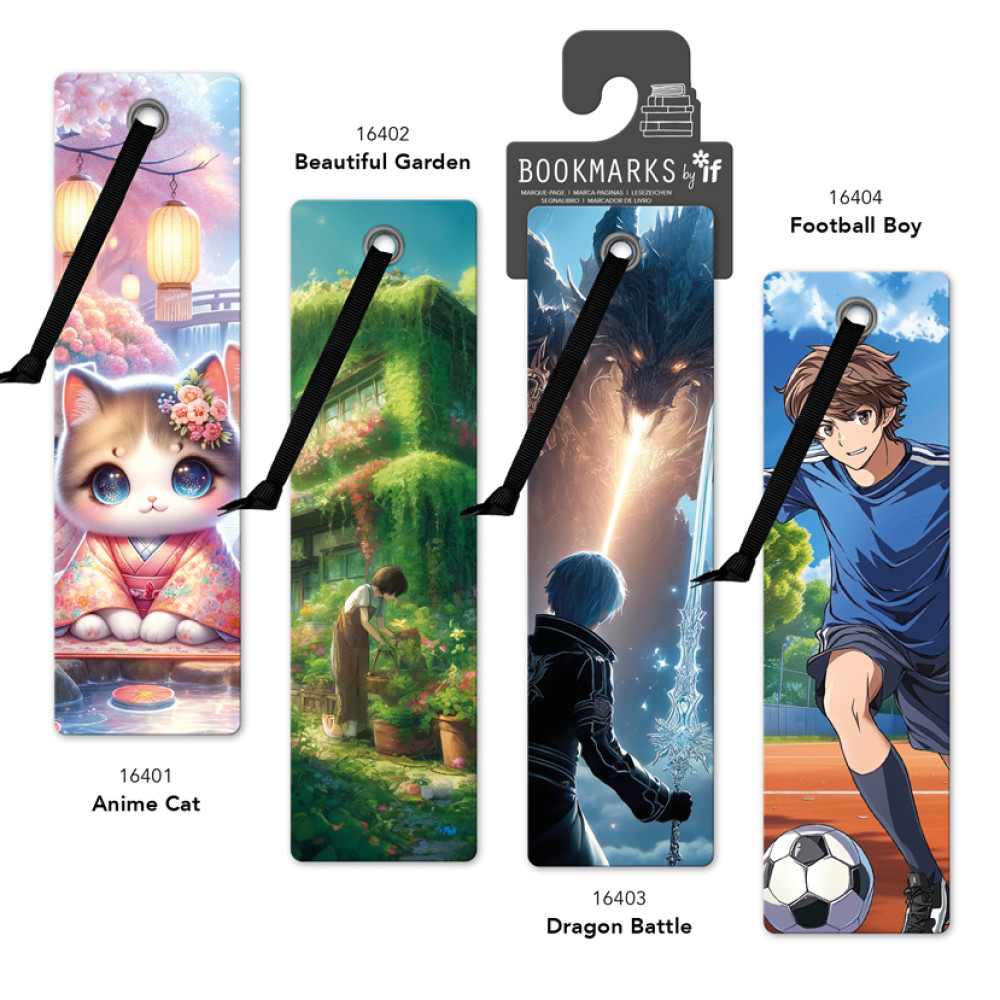 Reproduced on good quality thick ethically sourced boardTwelve different images covering several manga genre styles - something for everyoneWith metal eyelets, quality grosgrain ribbon and gloss detailingPresented on a bespoke IF cardboard hangerPart of the Bookmarks By IF program