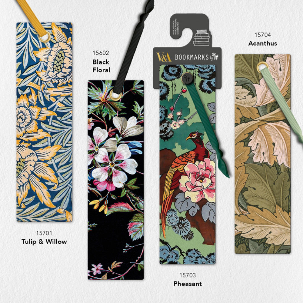 Beautifully reproduced rich, vivid V&A patterns, on superior quality faux leatherBrass eyelet and grosgrain ribbon with V&A pattern details printed on the reverseCarefully chosen subject matter to appeal to a wide audienceGlobal license - no territory limitationsPresented on a special foiled V&A version of the bespoke IF cardboard bookmark hanger