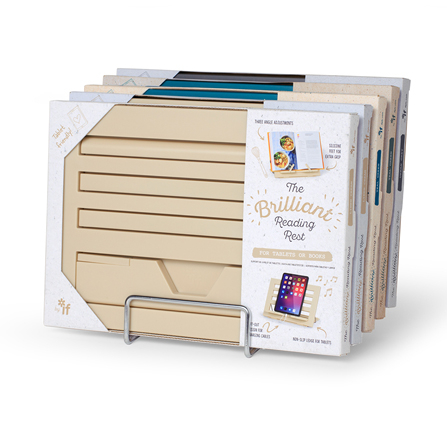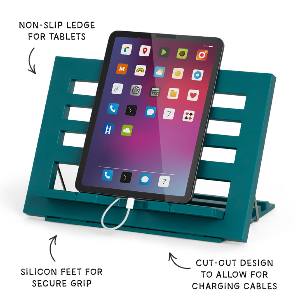 Holds small & larger books, folds down flatWith non-slip ledge for tabletsCut out design to allow for charging cablesSilicon feet for secure gripNew colours and new plastic free packaging