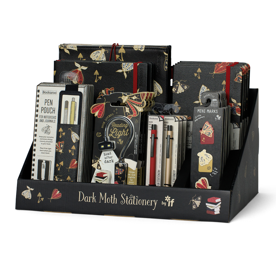 A really cool set of themed giftable stationery and lifestyle accessories enhanced with this beautiful and symbolic moth motif print - one of the images strongly associated with some romantic fantasy fiction. Another popular theme for 2025, this striking mystical black red and gold imagery can be seen in through literary, interiors, fashion and gift. Our 'Ready to Retail' display features some of our best selling individual items, including our staple A5 hard back journal, the 'Bigger Things' Journal with printed edges, our dinky clip-on booklight in the same theme, a 'Bigger' Book Pouch to keep your notebooks, novels and iPad safe. Now designed with expanding sides, so you can keep even more safely inside... or maybe just bigger books? With additional Bookaroo pens in a matching colour, Pen Pouch and our fabulous Mini Marks. Highly shoppable and looks great in a booky or gifty environment.