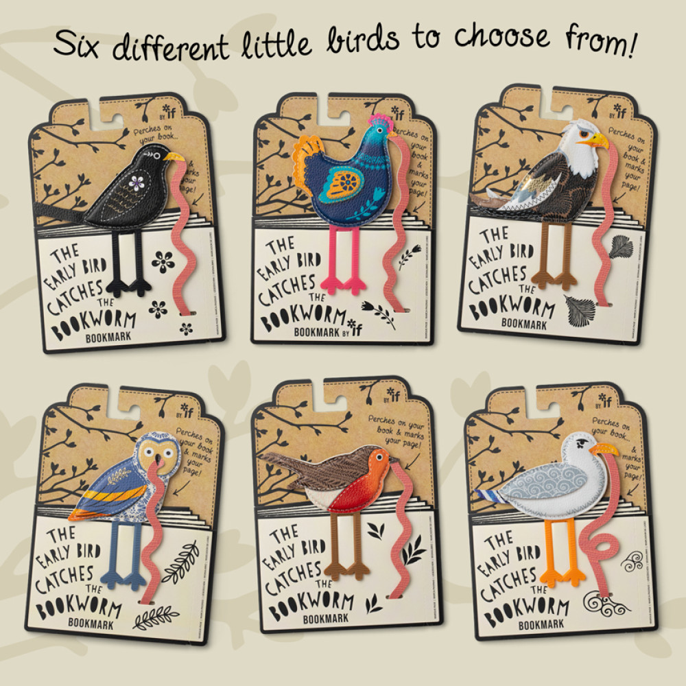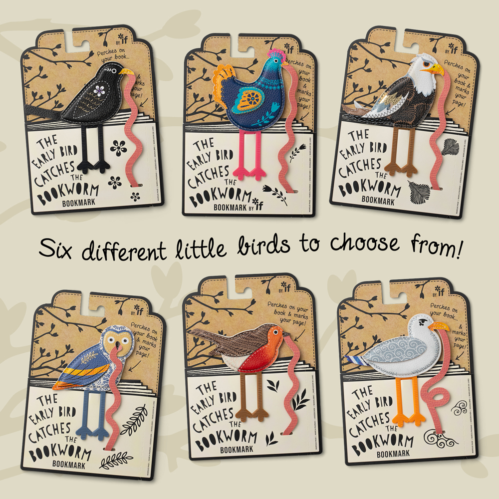 Bright colored 'folk' style early birds with clip legs to hold on to your bookUse the dangly worm to mark your page. Great fun!Made in padded faux leather with double sided designSix different little birds to choose fromPresented in lovely gifty display packaging with a fabulous 'tree' point of sale available