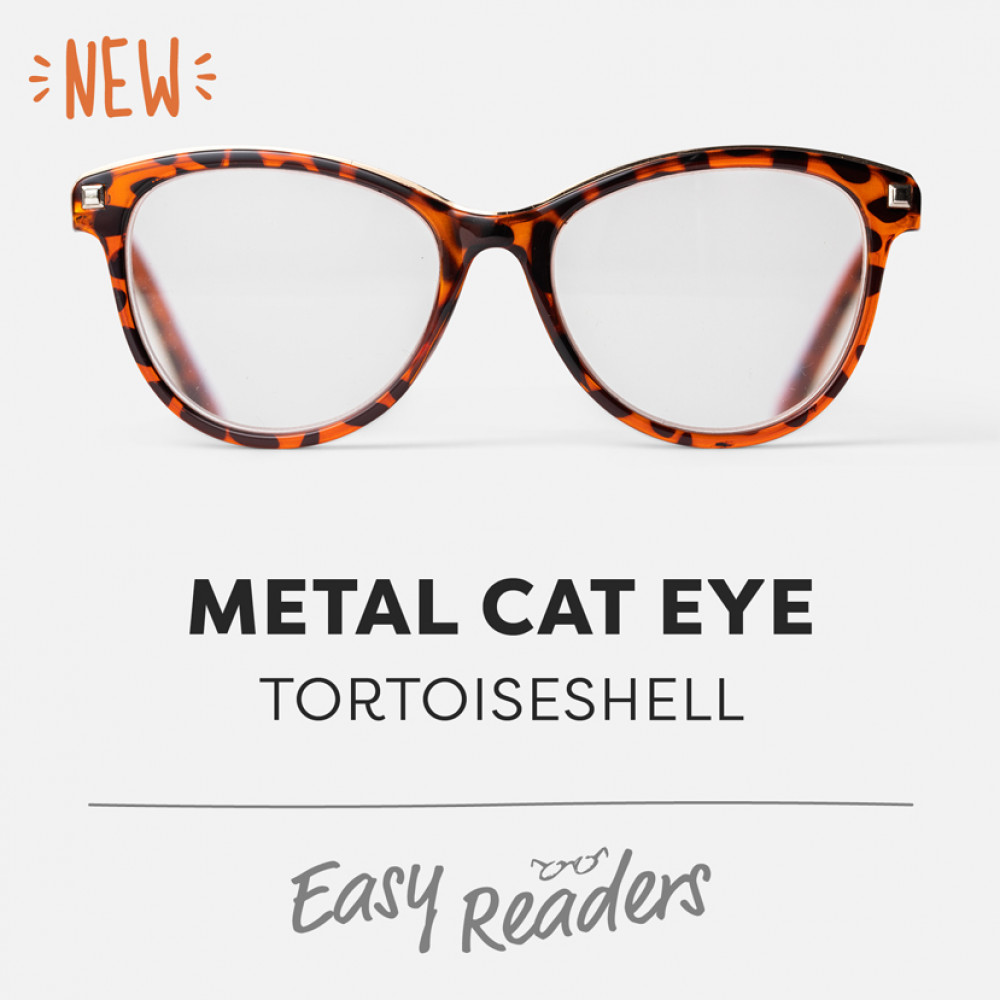 Tortoiseshell metal cats eye frames with metal arms and matching end piecesAvailable in 3 strengthsSupplied on a ‘retail ready’ display hookQuality tested to all UK, EU and US standardsSprung hinge armsBuy this style only, or as part of an Easy Reader program