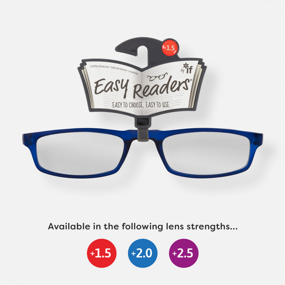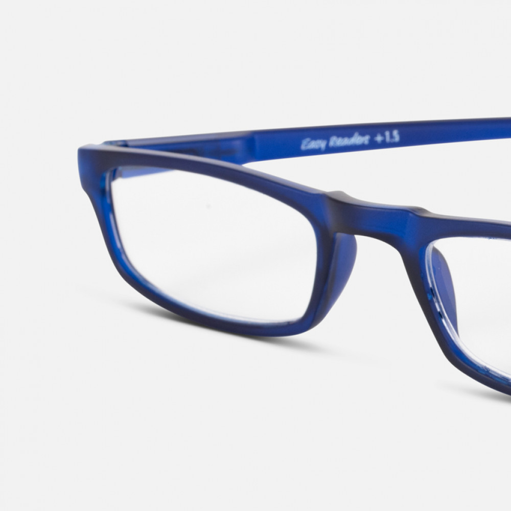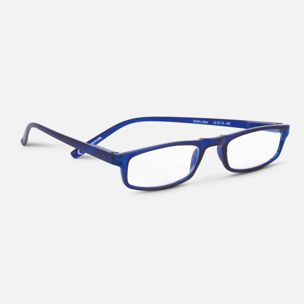 Half moon style frames in opaque blue acrylic. Look through or peer over!Available in 3 strengthsSupplied on a ‘retail ready’ display hookQuality tested to all UK, EU and US standardsSprung hinge armsBuy this style only, or as part of an Easy Reader program