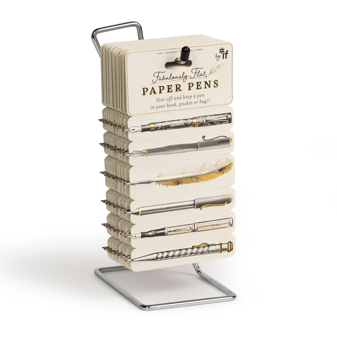 Six beautifully illustrated and gold foiled designs printed on both sidesAll with black ink and really work!Simply bend and tear off whenever you need a pen!Come with wax tips to prevent unwanted scribbles at retailMake an intriguing display and unique gift
