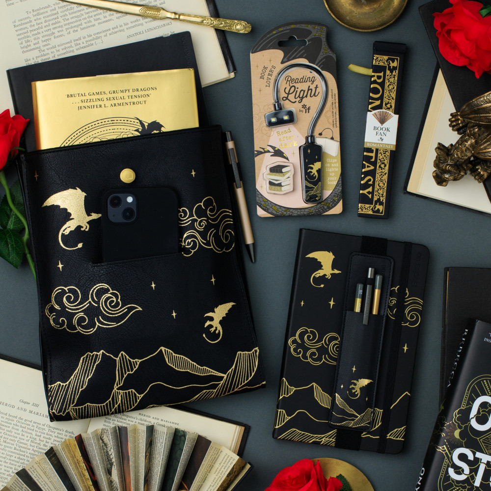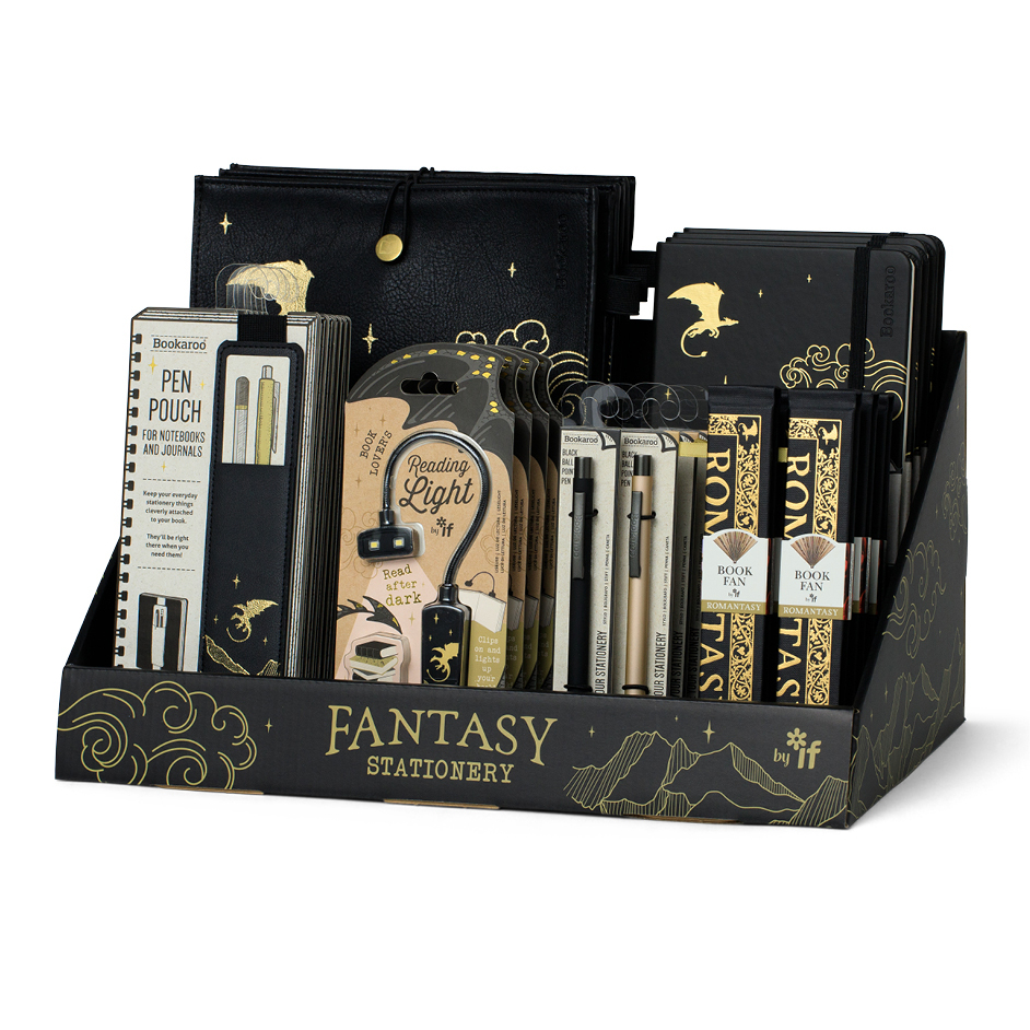 A set of themed giftable stationery and lifestyle accessories based on the current publishing phenomenon of romantic fantasy literature where magical realms & mystical creatures are the backdrop for romance. A strong theme for 2025, this very striking black with gold foil dragon & mystical landscape image is an especially current theme in literary, interiors, fashion and gift. This 'Ready to Retail' display features some of our best selling individual items, including our staple A5 hard back journal, our dinky clip-on booklight in the same theme, a 'Bigger' Book Pouch to keep your notebooks, novels and iPad safe. Now designed with expanding sides, so you can keep even more safely inside... or maybe just bigger books? With additional Bookaroo pens in a matching colour, Pen Pouch and our NEW Romantasy Book Fan. Highly shoppable and looks great in a booky or gifty environment.