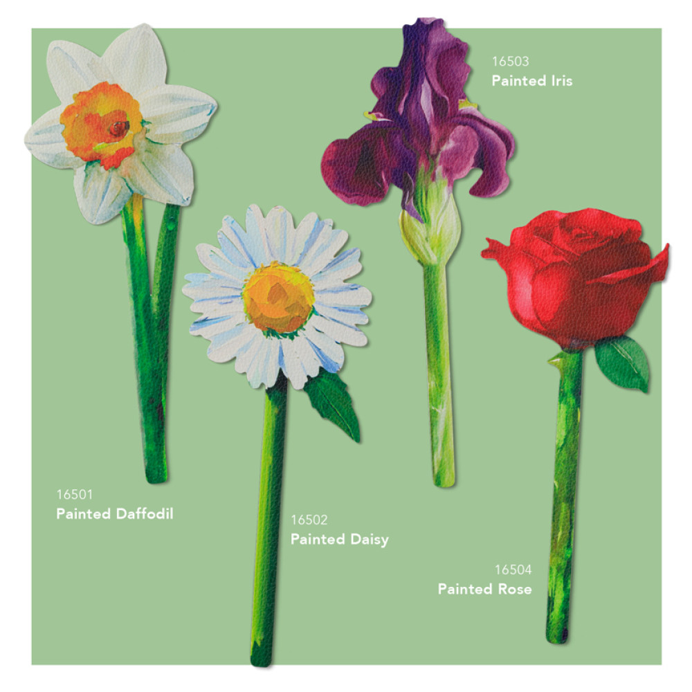 The perfect 'Book'quette! A riot of color, this assortment of 12 different single stem flower bookmarks with brighten your day - and your book. Beautifully printed on both sides on excellent quality textured 'faux leather', these stems slot snugly between your pages. Say it with flowers - mark it with a flower bookmark. Available as a starter pack, with a free standing or clip strip vase display. Looks stunning in store.