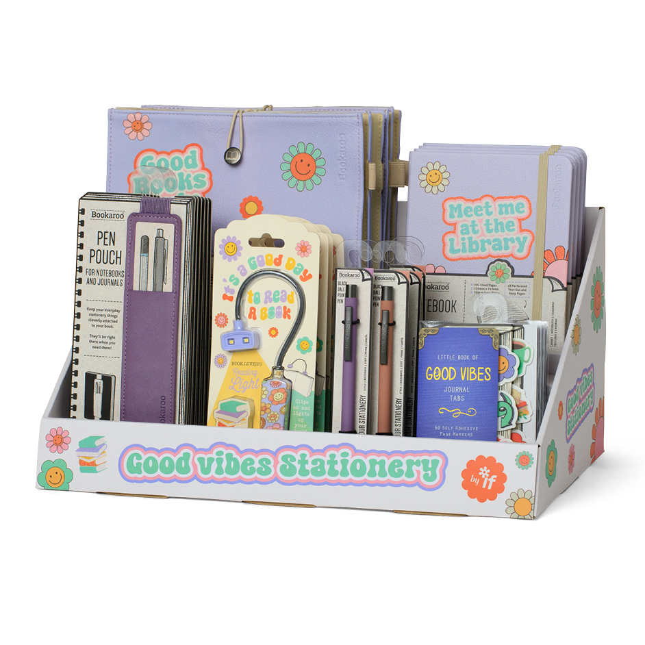 A set of bright and positive themed giftable stationery & lifestyle accessories. Exuding 'Good Vibes', this set radiates the current mindful positive messages. This 'vibe' is a very popular message and 'look' with a pastel coloured 70s style, smiley flower pattern. This 'Ready to Retail' display features some of our best selling individual items, including our staple A5 hard back journal, our dinky clip-on book light in the same theme, a 'Bigger' book pouch to keep your notebooks and novels in and keep your iPad safe. Now designed with expanding side so you can keep even more safely inside... or maybe just bigger books? With the additional Bookaroo Pens and ever popular Pen Pouch in matching colour and our NEW Eclectionery Journal Tabs. Highly shoppable and looks great in a booky or gifty environment.