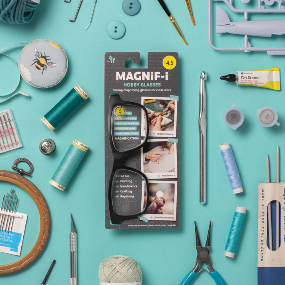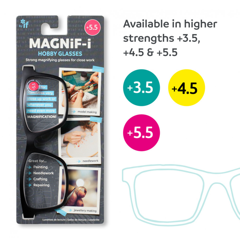 High quality tested frames and lensesAvailable in higher strengths +3.5, +4.5, +5.5Comfortable frames with sprung hinges and large lense areasGreat for any close up work including repairing, needlework, jewellery making or paintingA new addition to our Magnif-i - a smart, co-ordinated range of well designed, good quality magnifying products for everyday use