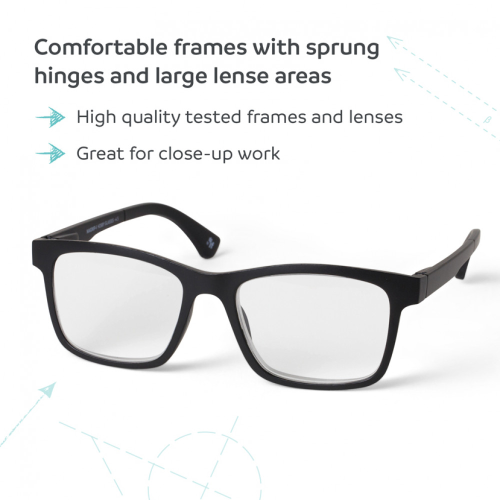A handy pair of extra strong magnifying lenses in comfortable, good sized frames, ideal for very close up or detailed work. The perfect hands free tool for hobbyists fed up of balancing two pairs of glasses on their nose at once! Choose the extra strength to suit your use. A new addition to our Magnif-i range.