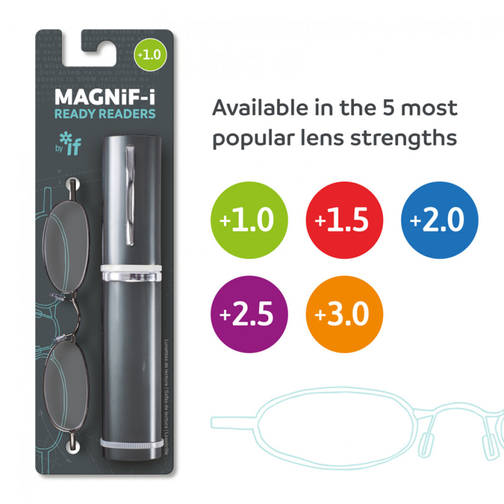 A very useful pair of everyday reading glasses in a strong protective case, ideal to keep anywhere, from kitchen drawers and toolboxes to glove compartments and bedside tables, for those moments when a little more magnification might be needed! Practical, robust, and unisex, these no-nonsense glasses are an evergreen best seller. Part of the MAGNIF-i range – a smart coordinated program of well-designed magnifying products for essential use
