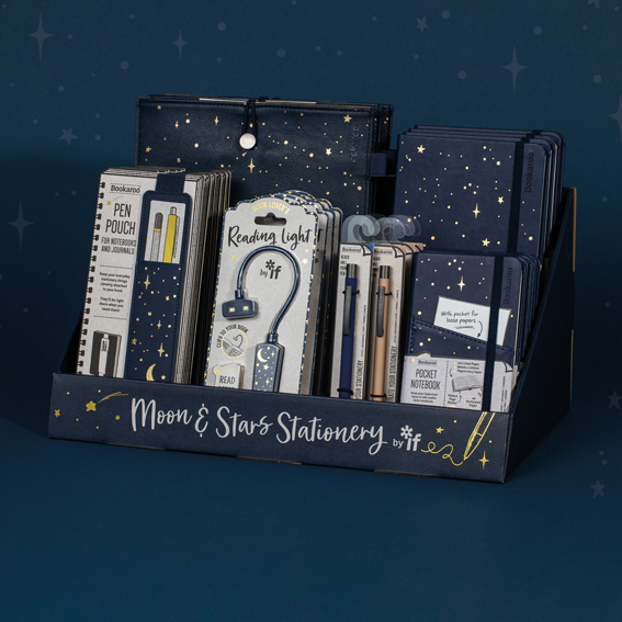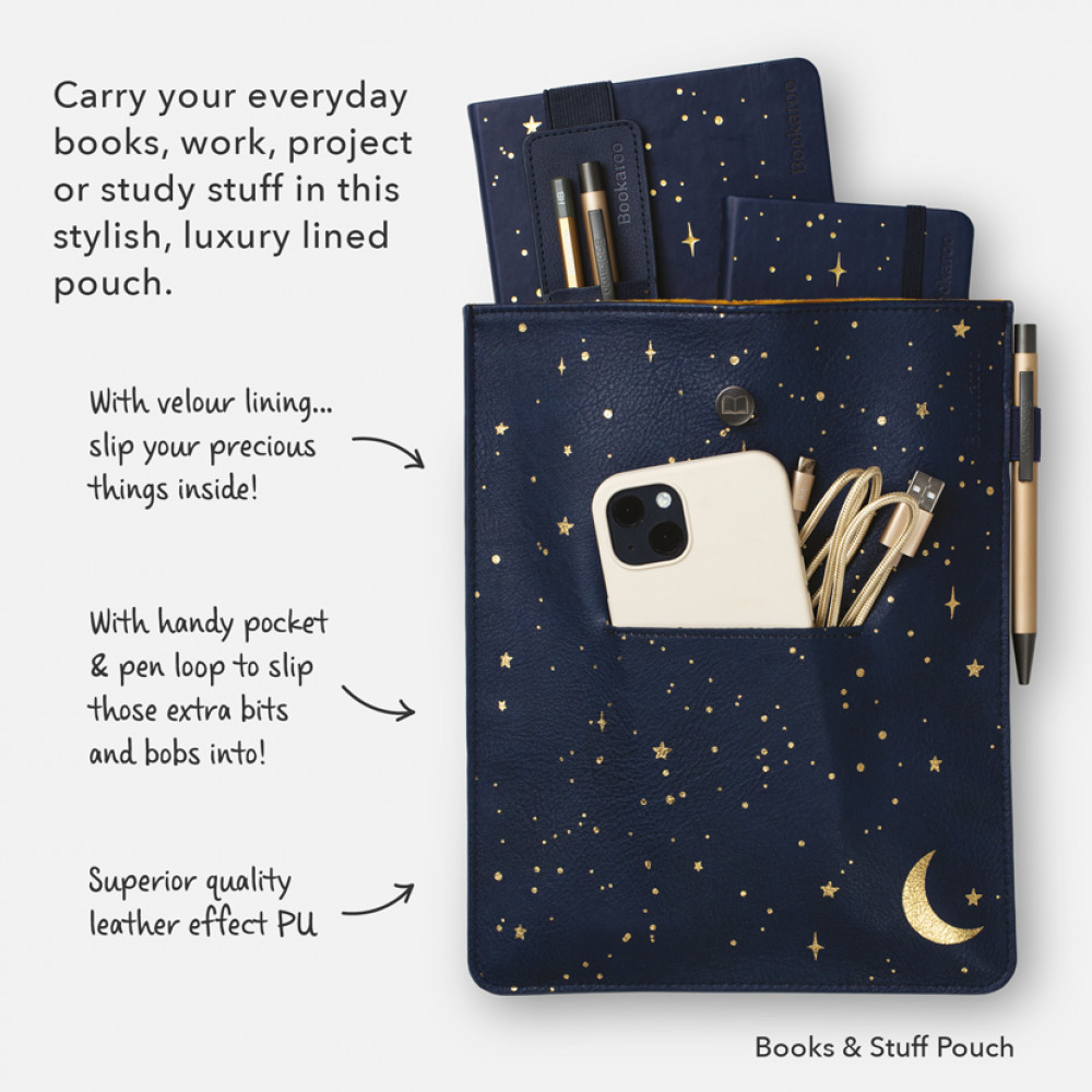 Featuring our A5 and A6 journals in soft, deep blue faux leather with gold-foiled moons and stars. Complete with all the usual Bookaroo features  Plus our Best selling matching pen pouch to hold your co-ordinated Bookaroo Gold & Blue pens  And beautifully soft, lined matching Book Pouch to keep your notebooks, novels or iPad safe  Introducing our brilliant dinky and decorative clip-on book light - perfect for reading after dark of course!  All ready to retail in our countertop cardboard display