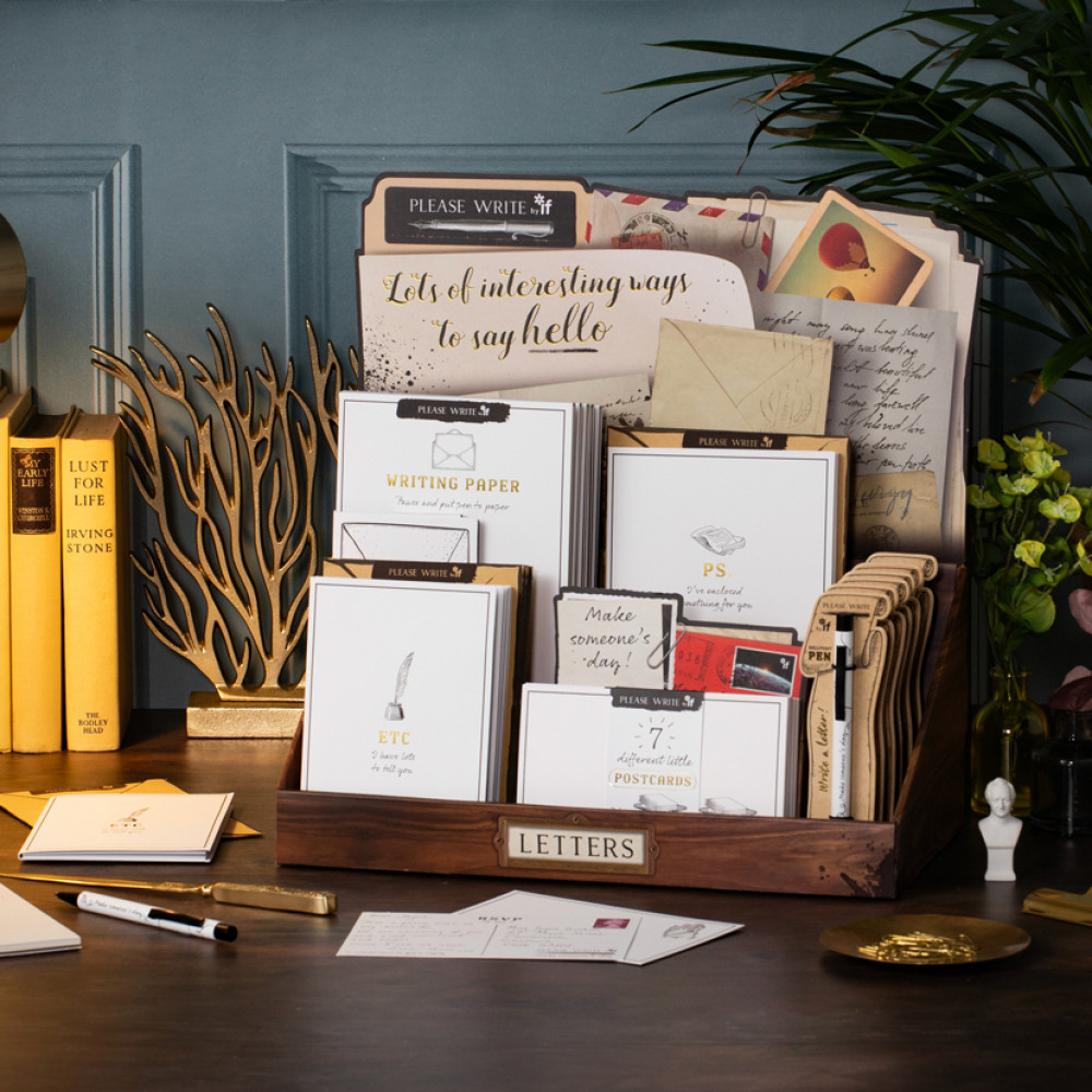 ETC - A clever-fold out notecard (& envelope) designed for those who run out of space in a normal card. This one reveals 5 sides of neatly ruled good quality card. Write a loooong note!WRITING PAPER - Something to write? A modern version of a traditional writing pad with envelopes. 30 sheets of 100gsm smooth paper, guide line sheet and magnetic pocket with 10 envelopesP.S. - A notecard & envelope with a difference. Enclose a little note, photo, family newsletter, (or even just a stamp) in the neat little corner pocket and there's still plenty of room to write your message7 LITTLE POSTCARDS - Seven little ways to say a quick 'hello'. A set of good quality traditional little postcards, each with a different beautifully illustrated image. Make someone's day every dayPEN - A pen with the potential to make a lot of people very happy. With an extra large ink cartridge, a soft touch printed barrel and pretty shaped packaging. The perfect Please Write partner