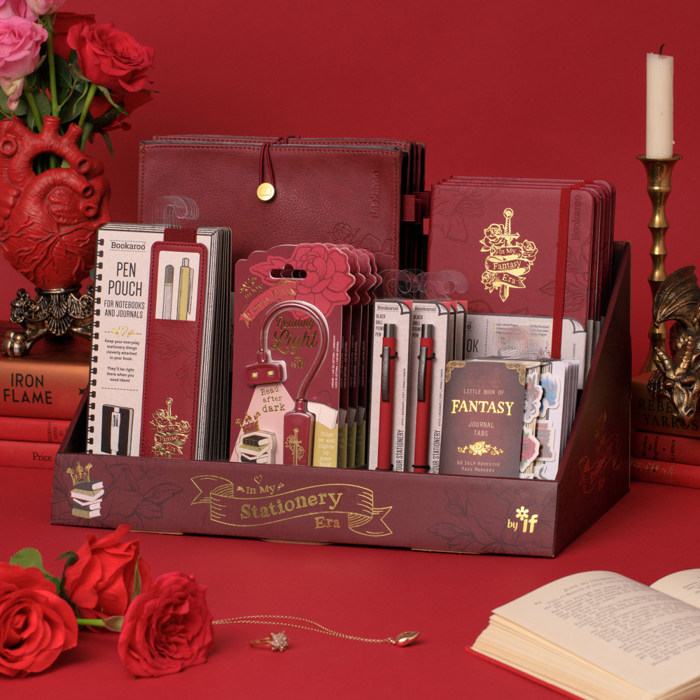 A set of themed giftable stationery and lifestyle accessories based on the phenomenon of fantasy and romance literature. A strong and distinct look in deep red with a rose floral design with a gold foiled 'In my Fantasy Era' emblem. This imagery is an especially current theme in literary, interiors, fashion and gift. This 'Ready to Retail' display features some of our best selling individual items, including our staple A5 hard back journal, our dinky clip-on booklight in the same theme, a 'Bigger' Book Pouch to keep your notebooks, novels and iPad safe. Now designed with expanding sides, so you can keep even more safely inside... or maybe just bigger books? With additional Bookaroo pens in a matching colour, Pen Pouch and our NEW Eclectionery Journal Tabs. Highly shoppable and looks great in a booky or gifty environment.