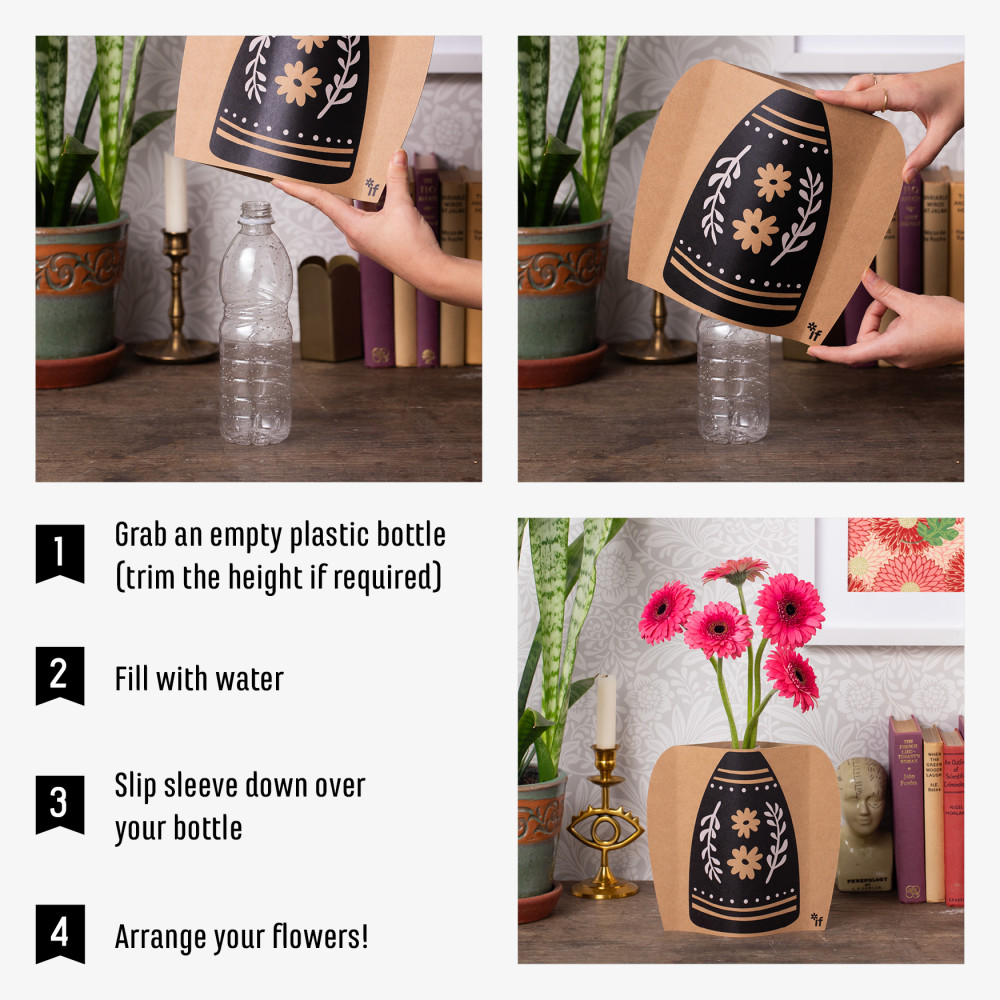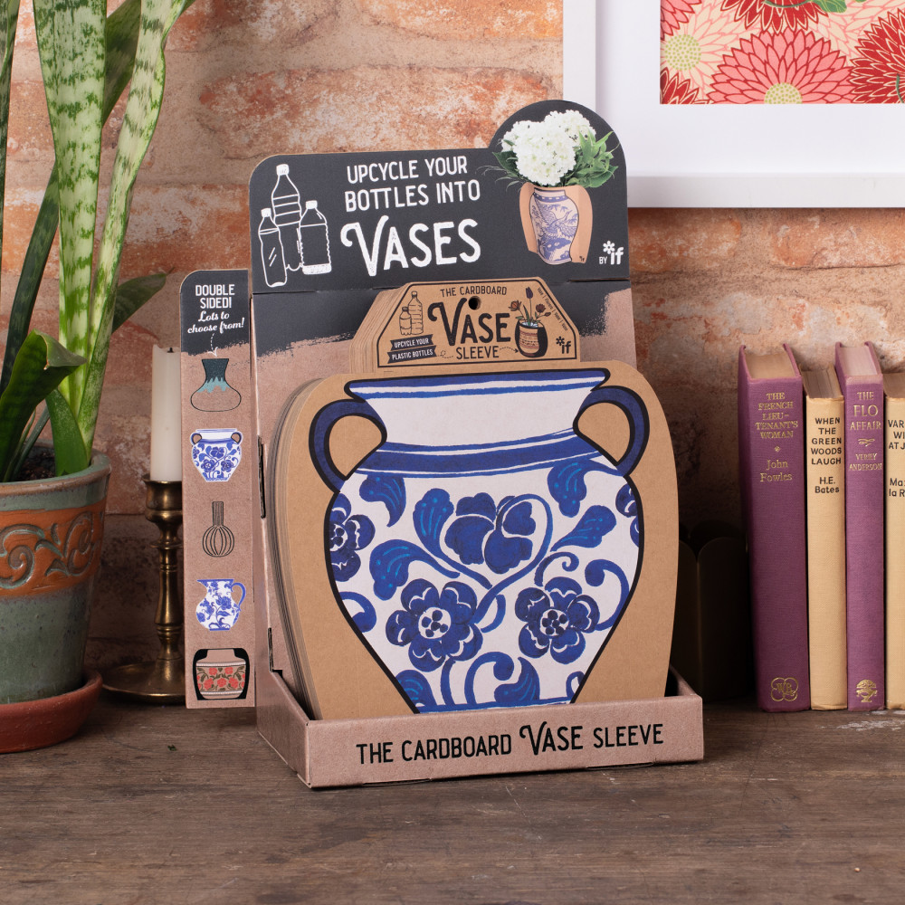 It is just that - a sleeve that fits over your empty plastic bottles and instantly transforms them into really cool vases to display your flowers. Generously we have given you one design on each side, so you can spin the sleeve and ring the changes! Simply choose your bottle - anything from a small 250ml water bottle with narrow neck (maybe for a single red rose?) to a 2 litre pop bottle cut down to give a wider neck for a serious bouquet! Made from recycled material and recyclable itself this is a lovely sustainable postable present. Great for garden centres, florists and stylish gift & interior stores.