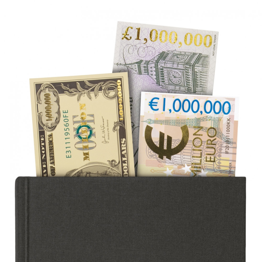 3 currency designsQuality printed paper front and backFoiled lettering on both sidesRealistic design (but not legal tender) Larger-than-life note size