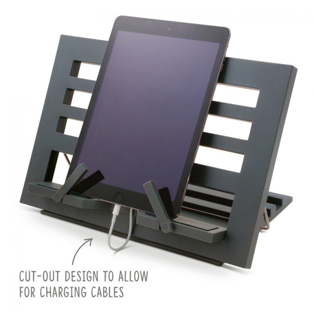Holds larger books, folds down flatNow with a non-slip ledge for tabletsCut out design to allow for charging cablesSilicon feet for secure grip5 smart new colors available
