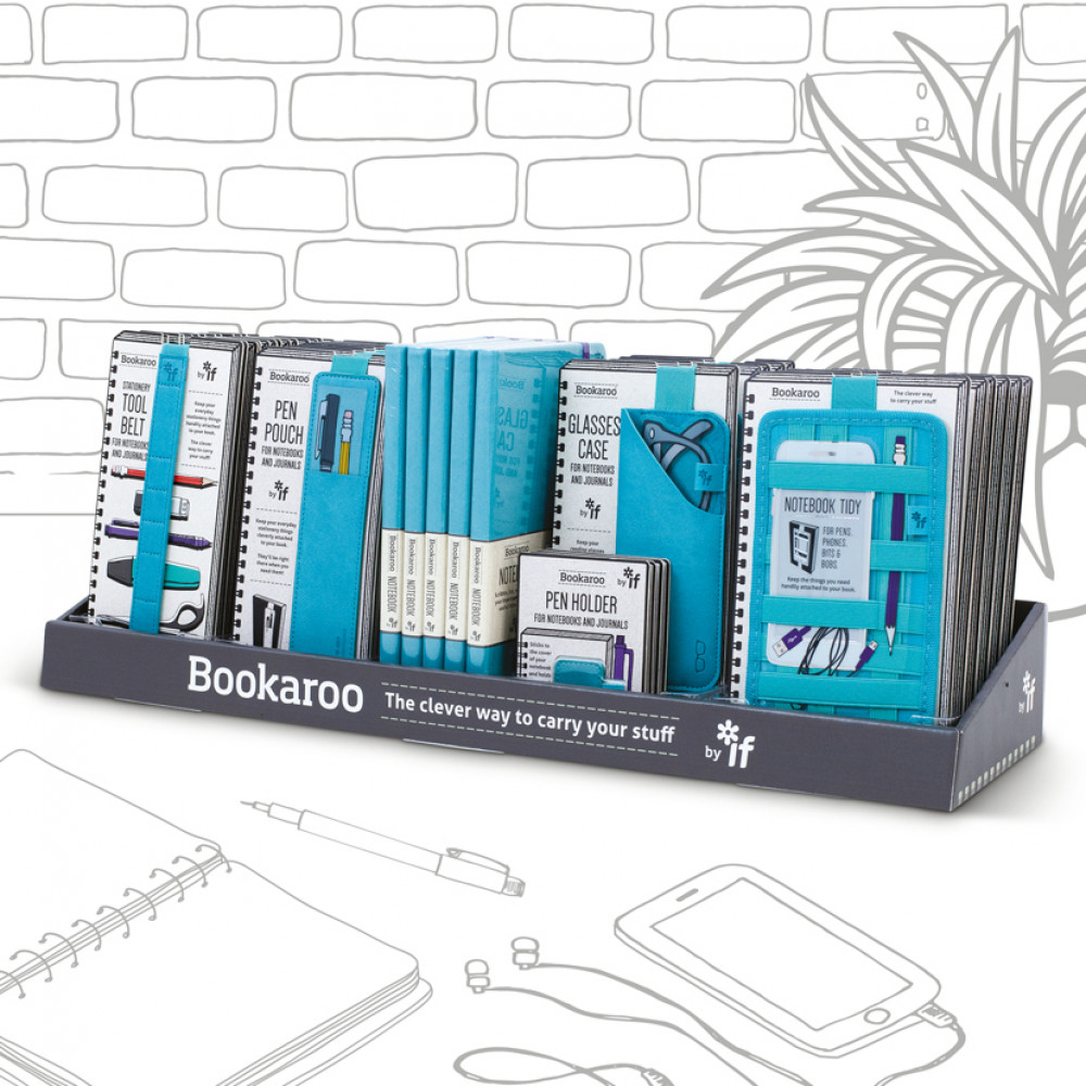 An eye-catching, color-coordinated, 'mini-range' of our top-selling BOOKAROO accessories in Turquoise, displayed in a compact 24"x 6" (60cm x 15cm) display. Our displays come preloaded and ready to go but if you fancy making a tweak or two just give us a call and let us know what you would like. All the products in this display are available individually so you can repeat order however you like.