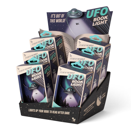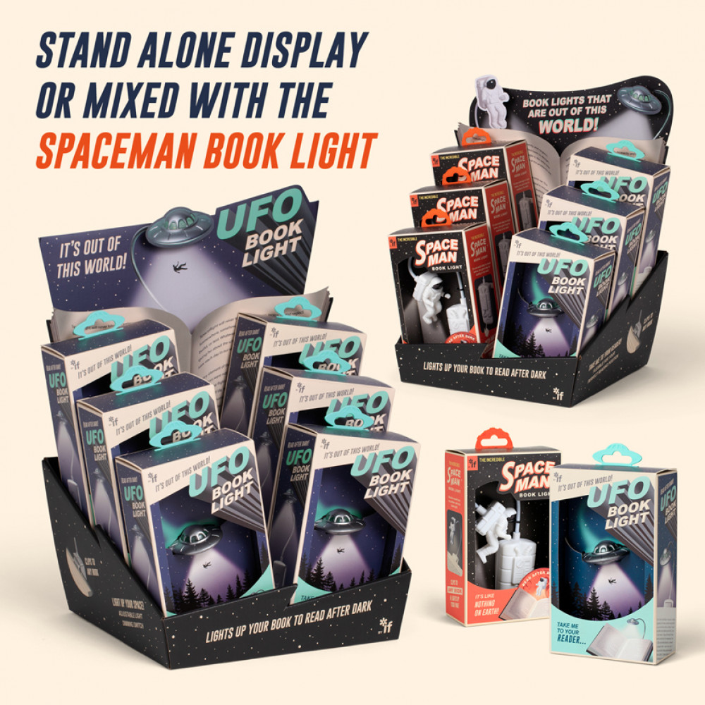 No need to visit Area 51 to grab yourself an alien light source! This 3D UFO spacecraft is fuelled by 3AAA batteries for a longer life so it won't leave you out in the dark. Clip your 'mothership' control panel to any book and this 'out of this world' light (with 3 LEDs) will cast a light beam down onto your page, so you can carry on reading after dark. In a really cool retro style all-cardboard display box with moulded 'UFO' shaped hook and available with an earthling counter top display. Take me to your reader!