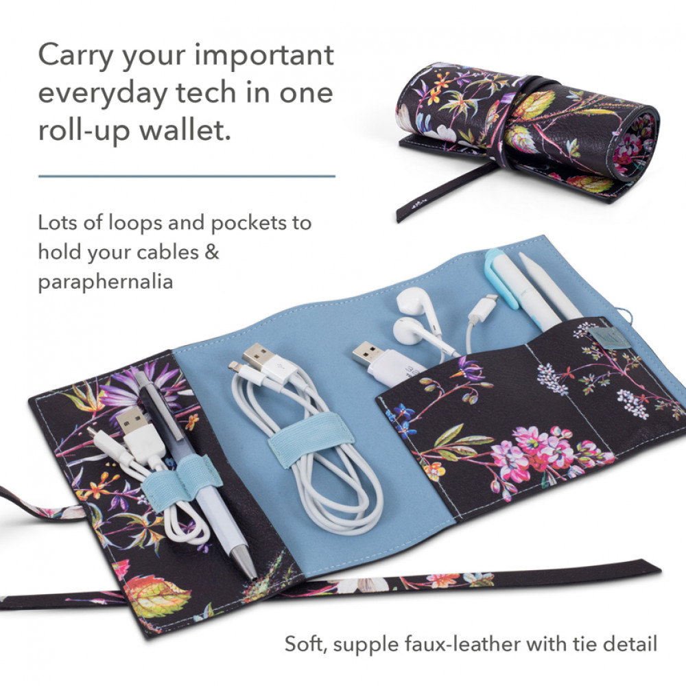 Stylish, safe storage for all your cables, chargers and techy stuffRolls up neatly - slips inside your bagBeautifully soft, printed faux- leather with liningFeaturing three on-trend pattern and color themesNo territory limitations